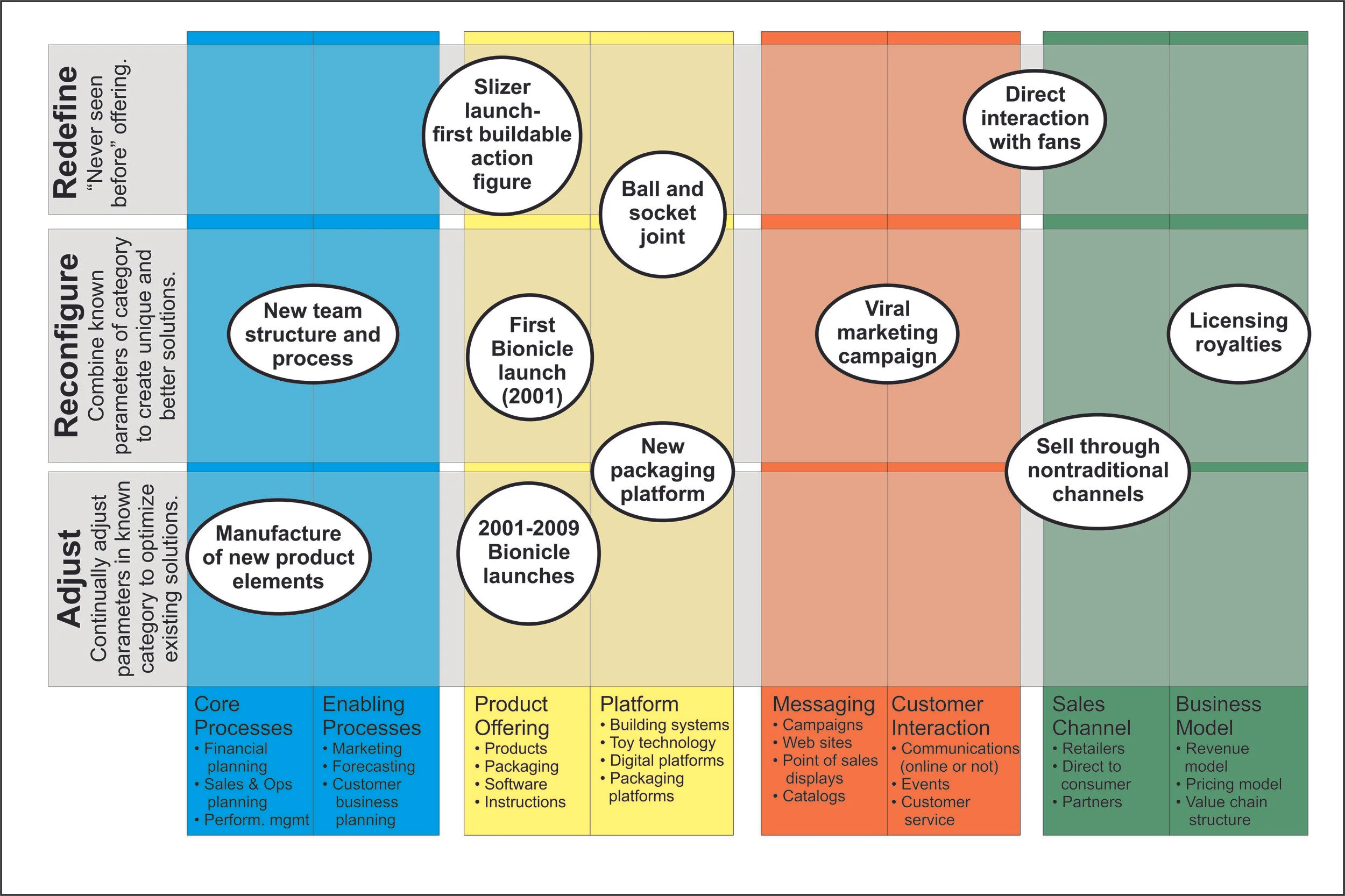 This matrix gave Lego a visual method to view what types of innovation they were initiating and across what business areas it would affect. It allowed them to control their innovation initiatives to create a balanced and sustainable system for innovation.